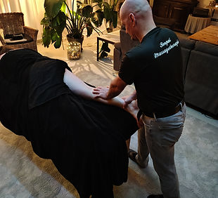 Deel van de ontspanningsmassage met hier de focus op het bekken , benen en de voeten .